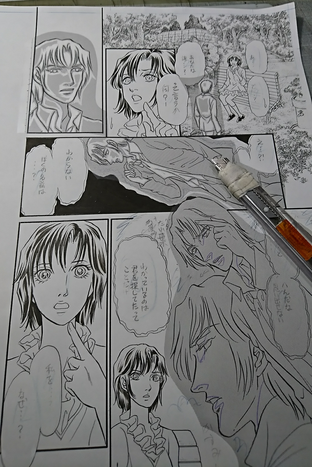 もうホントに秋でいいんですよね?またぞろ騙されてませんよね?(誰に) おはようございますアトリエ高階の山野にわとりです。 さて「げんこうのできるまで」連載企画も最終回になります。作画始まると早いですね。 そのうち、作画以前の高階先生の頭脳労働の跡などもアップしてみましょうか。 生々しくて良いかも。 最終回は仕上げの段階です。 ここからはほとんど不肖にわとりが担当しております。 いろんなスクリーントーンを貼っていきます。 まずは、この画面ですと男性キャラにアミをかけまして、削っていきます。 このキャラクターは人ならぬものなので、幽霊っぽさを出すためにこういう効果にするのですが、線の上以外を削り取ってしまうので、なかなか時間のかかる作業です。 自分的には好きな作業ですが、急ぐ時には難儀ですね。 トーンもったいないとも言います(笑)。 ちなみに自分は普通のカッターでやります。とても刃の消耗が激しく、しょっちゅうペキペキ折りながら進めます。 出来ました↓ ここに、女の子の服の柄、髪の毛にアミ、4コマ目の効果、5コマ目の背景とトーンをいれます。 服の柄は当アトリエのオリジナルのひとつ。 柄だけでも200近くオリジナルがありまして、管理が大変です。 4コマ目のベタから少しボカすトーン、これもオリジナルかな。 そして5コマ目の背景は、上の画像ですと先生の「かすみ~ナントカ」と指示が残っていますが、背景にフワッとした茂みや枝など配置するということなんですね。 これもオリジナルトーンが多数作ってあるのですが、長い年月の間にどんどん増えまして、何十種類(…もっとかな…数えたことなかった)もあります。 そのなかからにわとりが状況にあわせて使用する訳ですね。 出来ました‼️ これでこのページは完成と言っていいでしょう。 あ、あと吹き出しのセリフを清書しておきたいですね、作業中に汚れたり一部消えたりしていますから。 編集部へ送る前には、スキャンしてデータを残しておくのもこの時代大切です。 ……………今よく見たら、トーンの削り残しを見つけてしまいました………今さら………(´;ω;`) 見なかったことにしよう‼️ 以上、今どきフルアナログのげんこうのできるまででした! PR