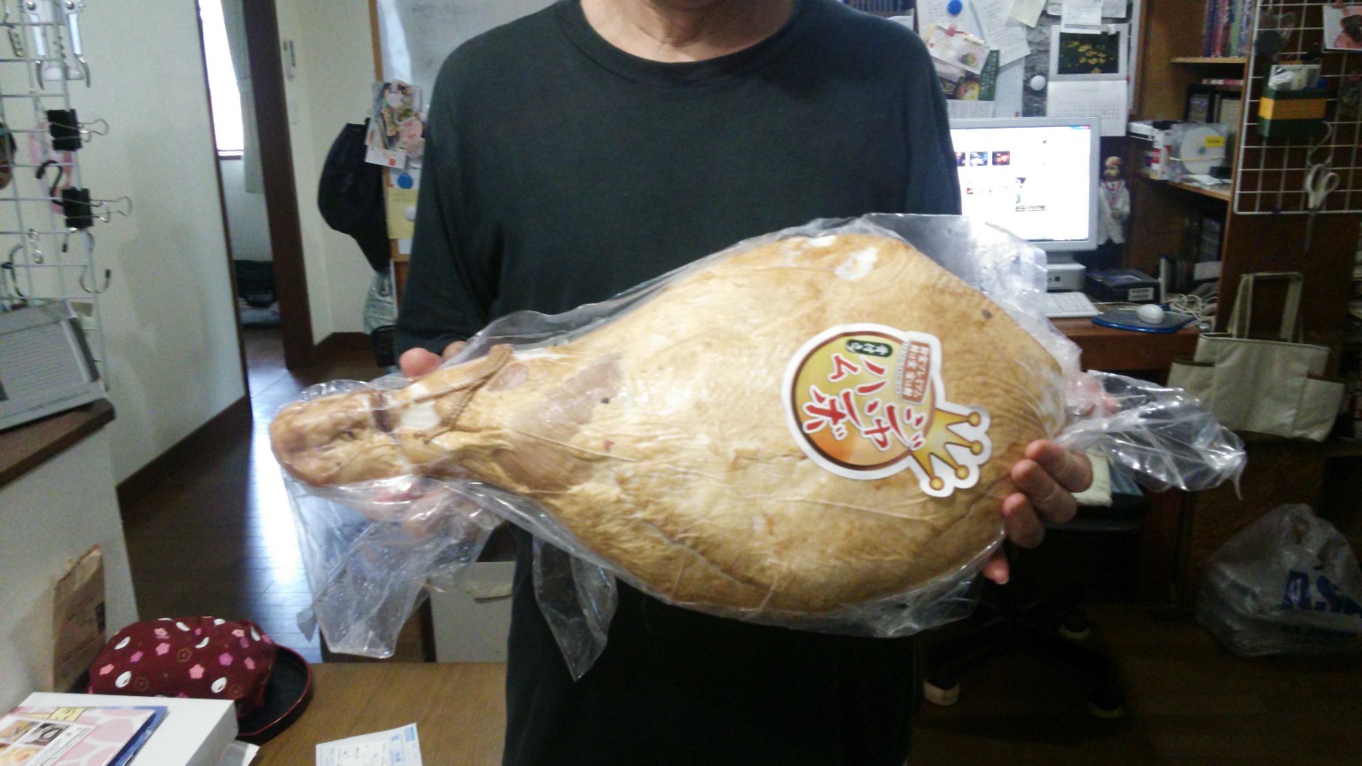 お見舞い申し上げます。復興は難儀を極めると思いますが、くれぐれもご自愛くださいますよう。 そして暑いです。うちクーラーないんでかんべんして欲しいにわとりですこんにちは。 今日は一身上の都合でたいへんくたびれてしまったので、古い写真でお茶を濁したり。 ↓は数年前、高階先生が発作的に注文したドでかハム。 なんでこんなものを購入したかというと、 「ルフィがかぶりついてる肉」だと思ったからだそうです。 ハマりものが少なめの高階先生ですが、ワンピはかなりハマっておられ、DVDもコンプする勢い。 わたくしも「サンジのパイユ」などこしらえて共鳴したりしております。 しかしこのハム、さすがに多過ぎて食べきれませんでしたモッタイナイ( ;∀;) 2018.07.04 Wed 15:03:37 新作予告 |