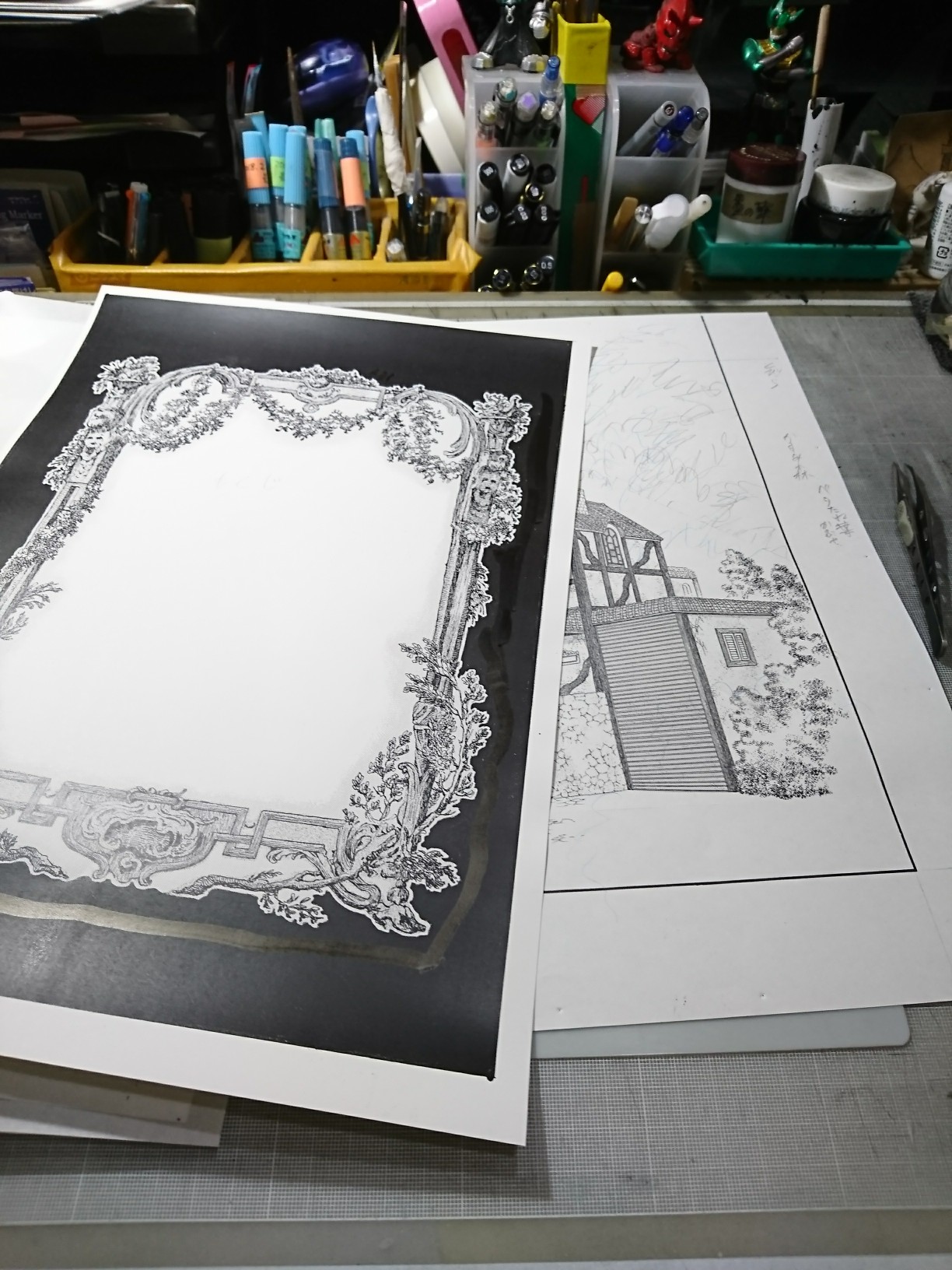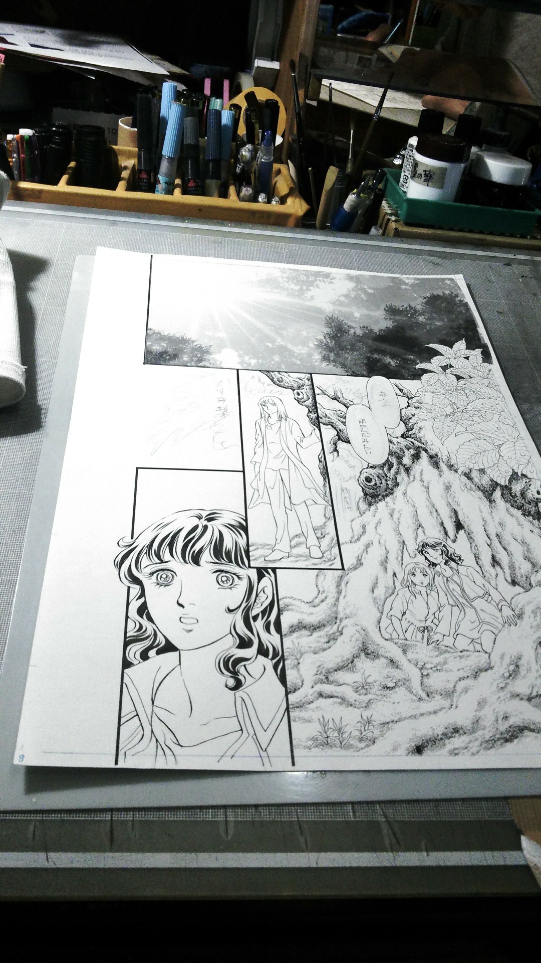 まずは良かった、つぎも頑張れー! そういえば前のロシア ドイツW杯は那須で仕事中だったような。 ときに、前の写真をチェックしてたら、こんな画像が出てきました。 制作中のなんかの覚えですね。 「よろず幻夜館」3巻あたりでしたか、ヤモリと呼ばれた娘の冒頭ですね。 デスクはにわとりの乱雑なデスク、1コマ目は出来上がっています。 背景も髪のツヤも入っているので、あとは樹や茂み、服のガラなどをオリジナルトーンなどで彩っていくだけです。あと一息の状況です。 にわとりが手を入れれば出来上がり、というところですね。 いやあ実にアナログ感満載ですね。 かわいい由貴ちゃん。 たしかこれは旧マジシャンのコミックの裏表紙用カットではないかと。 確認できたら情報は更新します。 2018.06.13 Wed 11:26:40 もったいないおばけすっかり梅雨だったり世界史に残る出来事があったりしましたが、みなさまいかがお過ごしでしょうか。アトリエ高階の中の人にわとりです。