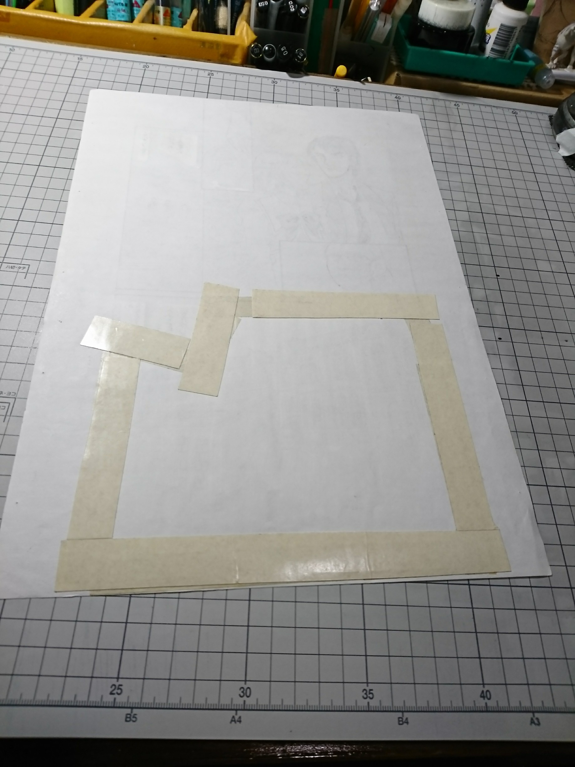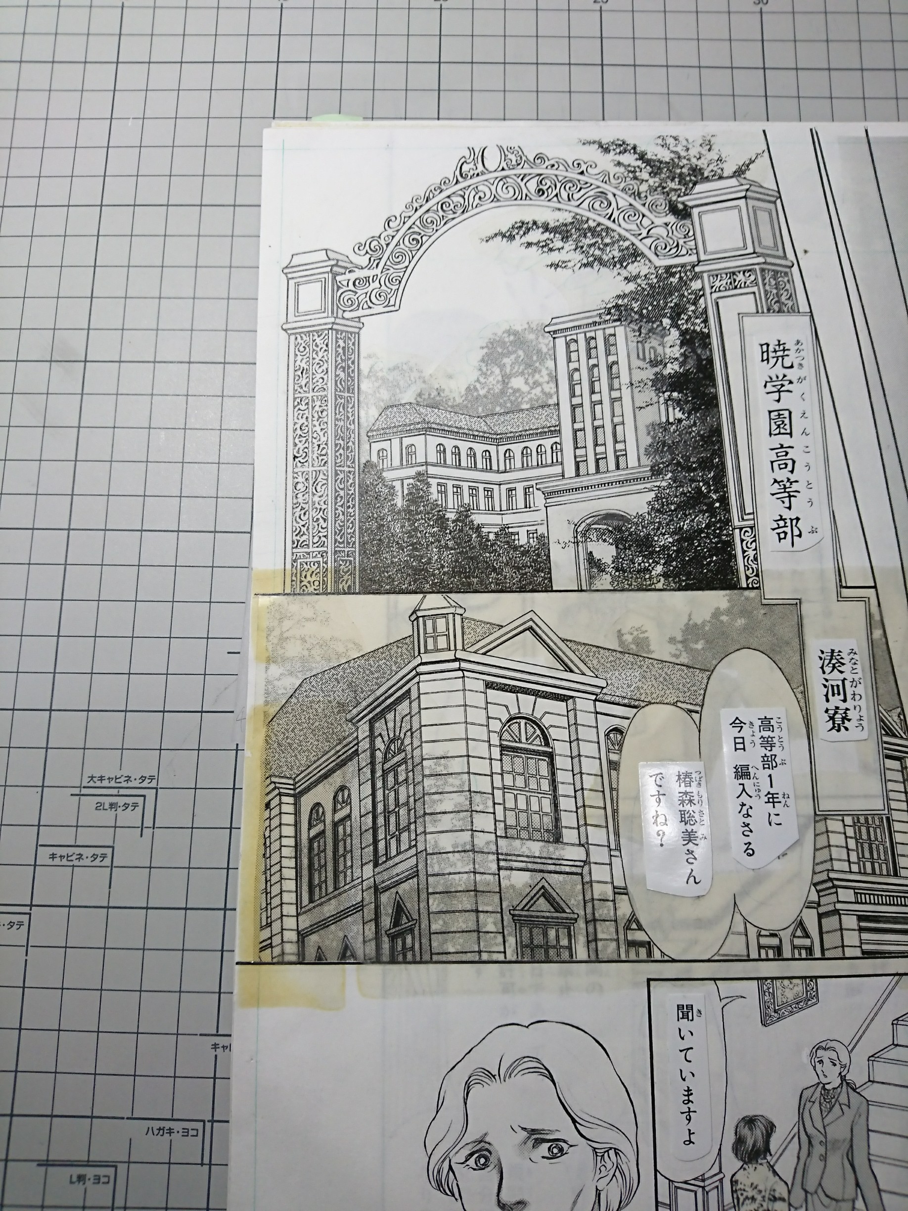 秋晴れ続きから一転、なんかうっとうしい天気になっておりますが皆様いかがお過ごしでしょうか。 さて、短期で銚子の現場に来ております。 原稿のメンテナンスが追い付かないもんで、追加でお仕事します。 原稿のメンテというのは↓こういうやつ。 画像を見ていただけるとわかると思うのですが、背景の切り貼りが割と発生します。 これもデジタルなら問題ないんですが…。 アトリエ高階では、長らく貼るのに「裏から紙テープ+両面テープを工夫したものでカバー貼り」、ということをしてきました。 当座はそれでよかったんですが、十年二十年してきますと事態は深刻に。 紙テープが変色して、油っぽい成分が表に染み出してきたのです。 それが右のような状態ですね。 それに気づいて、もう十年くらいは裏からスコッチテープのみ、というやり方に変更してきたのですが。 前に処理した原稿については、もう裏のテープを慎重にはがして、スコッチテープで補修するしかありません。 表にしみちゃった黄色は正直お手上げ。 これ以上悪くしないための最低限の処置ですが仕方ありません。 セロテープもダメ、マスキングテープもペーパーセメントも経年劣化は最悪です。 現状、紙原稿に貼っていいのはスコッチテープだけじゃないかと思います…。 (一応二十年くらいは大丈夫そうでした…経験上) 30年経ったらどうかまでは保証できませんが…。 2019.11.20 Wed 23:44:17 もう2年くらい?こんばんわアトリエ高階の山野にわとりです。